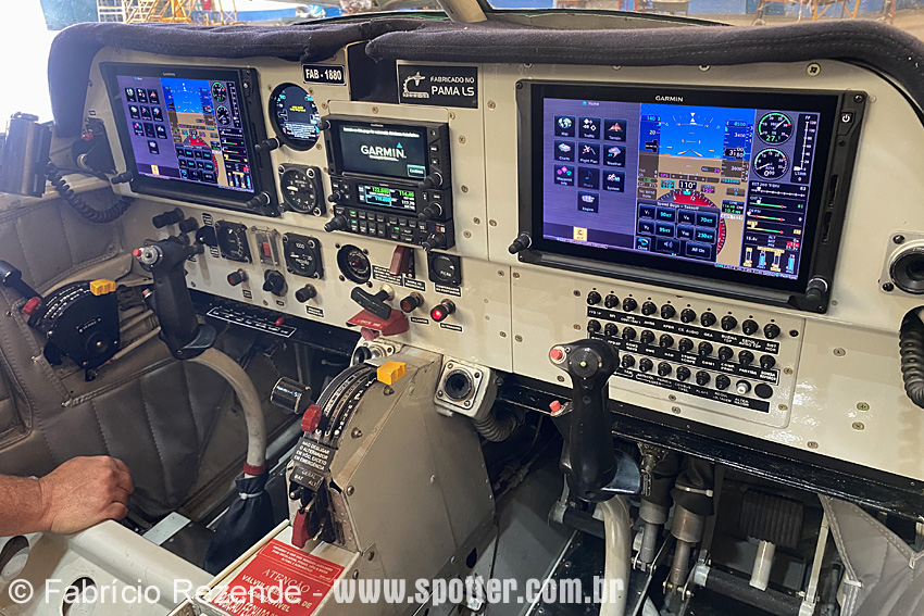 O T-25M recebeu um painel de instrumentos Garmin G600 Txi com duas telas digitais, Sistema de Navegação Global por Satélite (GNSS), Sistema de Aviso e Percepção de Terreno (TAWS), radar meteorológico StormScope e transponder ADS-B, além de equipamentos digitais de rádio para comunicação e monitoramento dos parâmetros do motor Foto: Fabrício Rezende - fabriciorsagro@gmail.com |
