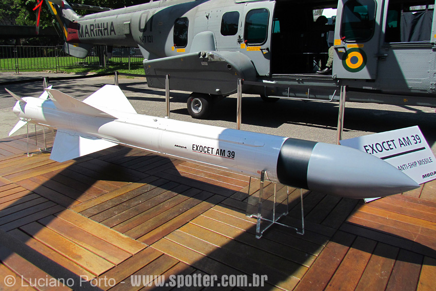 O míssil antinavio MBDA AM 39 Exocet possui um alcance de 70 km e utiliza sistemas de guiamento inercial e de radar ativo na fase final Foto: Luciano Porto - luciano@spotter.com.br |
