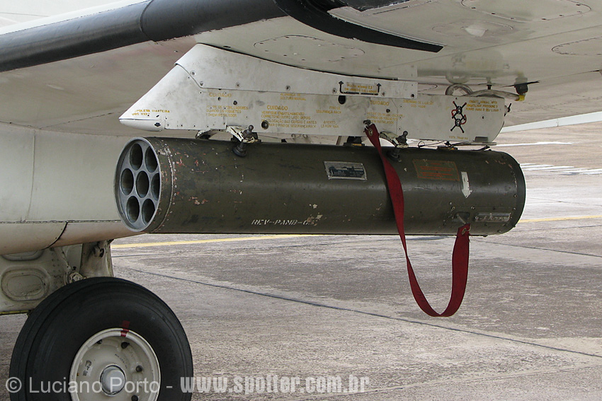 Lançador de foguetes de 70 mm Avibras LM 70/7 M7A-EB no suporte sob a asa Foto: Luciano Porto - luciano@spotter.com.br |