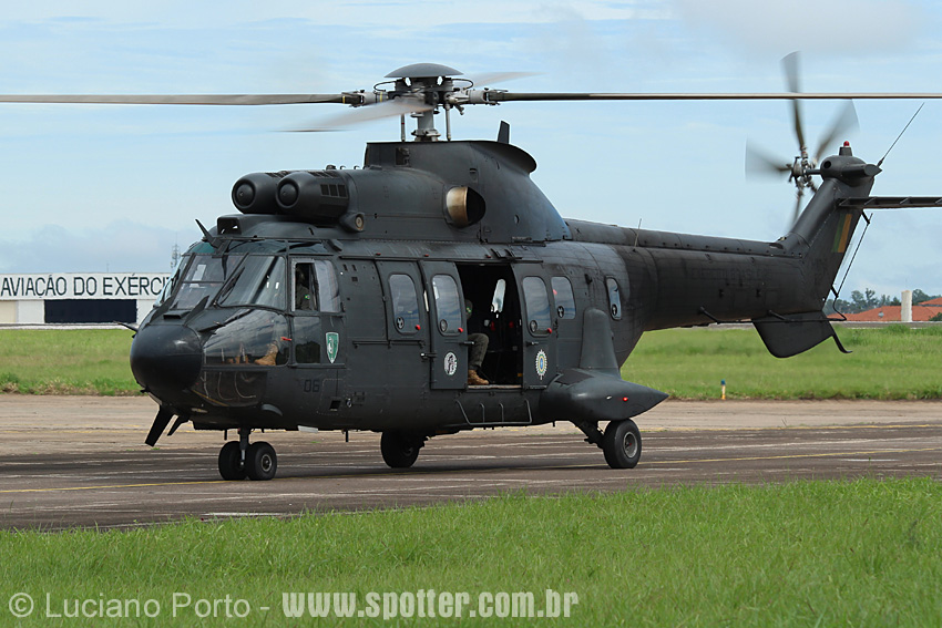 Na última atualização, publicamos 18 novas fotos nas páginas do 2º BAvEx Batalhão Guerreiro, sediado em Taubaté, São Paulo, e do 3º BAvEx Batalhão Pantera, sediado em Campo Grande, no Mato Grosso do Sul. Na imagem acima, o Eurocopter HM-3 Cougar EB-4006 do 3º BAvEx retornando para a Base Aérea de Campo Grande no dia 25 de março, após cumprir uma missão de transporte aéreo no Exercício Interamericano Cooperación XI. Além de atuar no deslocamento de bombeiros e equipes médicas, o 3º BAvEx cumpriu missões de combate a incêndios florestais utilizando um reservatório flexível Bambi Bucket com capacidade para 550 litros de água. Foto: Luciano Porto - luciano@spotter.com.br |