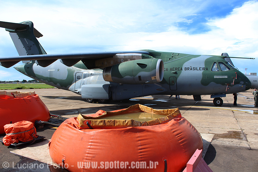 Na imagem acima, o Embraer KC-390 Millennium FAB-2858 do Esquadrão Zeus pousando na Base Aérea de Campo Grande no dia 05 de março, trazendo o RQ-900 Hermes FAB-7811 do Esquadrão Hórus para o Exercício Interamericano Cooperación, que foi realizado na Base Aérea de Campo Grande entre os dias 16 a 27 de março, com a participação de militares e aeronaves de diversos países integrantes do SICOFAA (Sistema de Cooperação entre as Forças Aéreas Americanas): Argentina, Brasil, Bolívia, Canadá, Chile, Colômbia, Estados Unidos, Paraguai, Peru, República Dominicana e Uruguai. O objetivo do exercício foi realizar ações conjuntas em cenários de catástrofes causadas por incêndios florestais, com missões de combate a incêndios em voo, transporte aéreo logístico, busca e salvamento e evacuação aeromédica. As fotos de todas as aeronaves dos esquadrões brasileiros serão publicadas em nossas próximas atualizações semanais. Foto: Luciano Porto - luciano@spotter.com.br |
