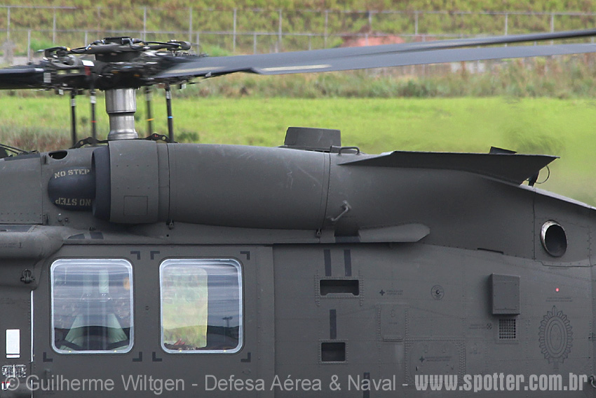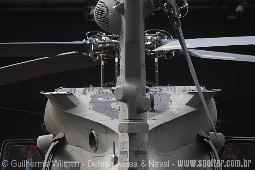 Visão traseira do HM-2A mostrando os locais para a instalação dos sensores defensivos e os escapamentos dos motores. A versão UH-60M tem o rotor de cauda, os estabilizadores e as pás do rotor principal dobráveis, diminuindo o espaço necessário no hangar e facilitando o transporte em aeronaves cargueiras Foto: Guilherme Wiltgen - wiltgen@defesaaereanaval.com.br |